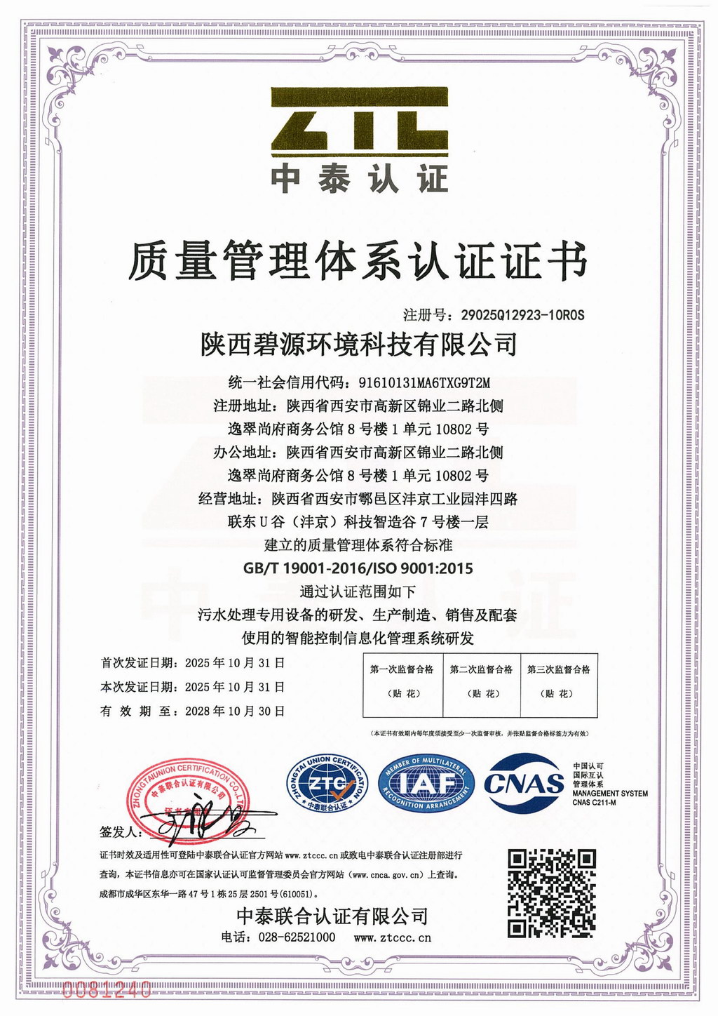 质量管理体系认证证书